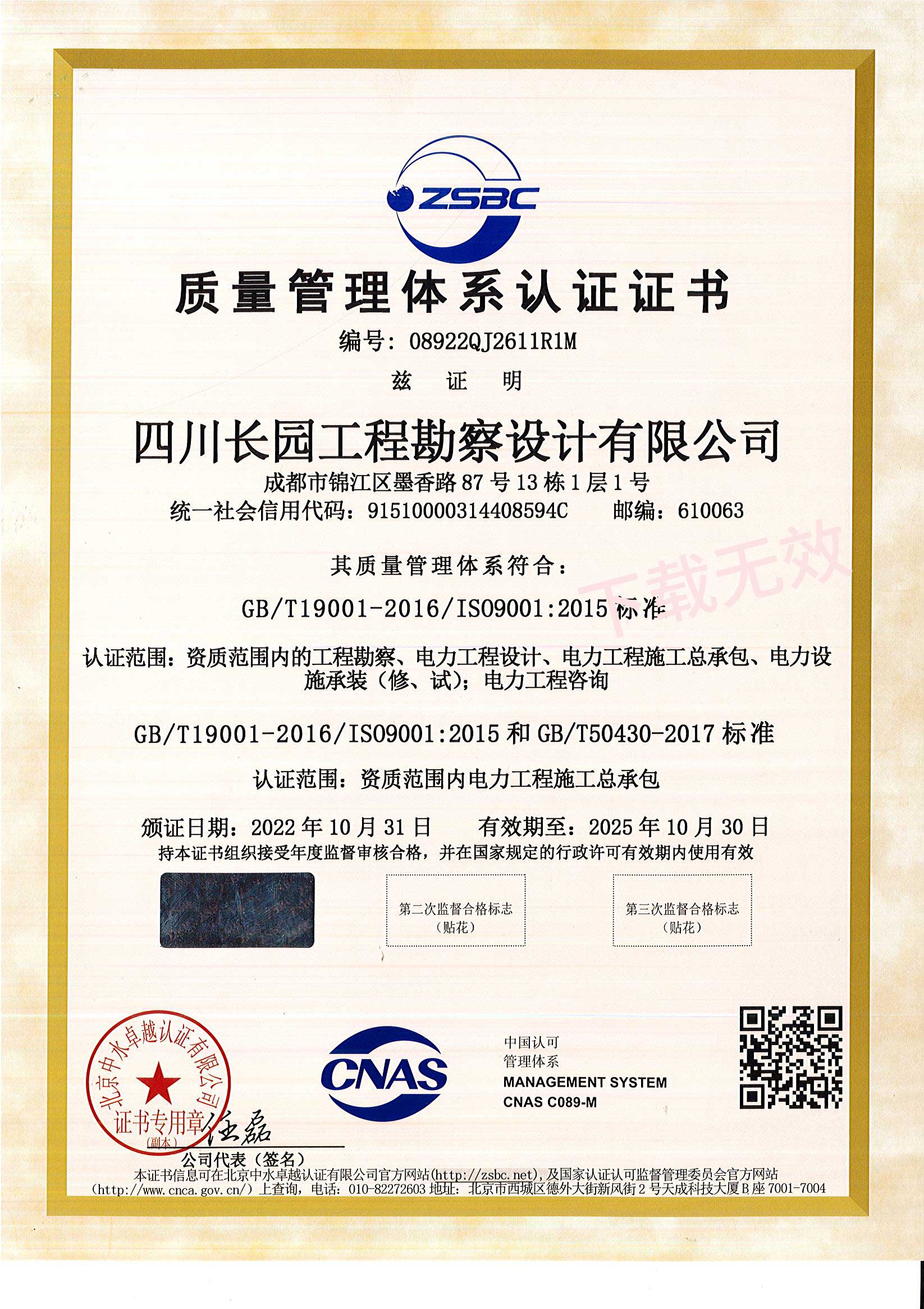 质量管理体系认证证书