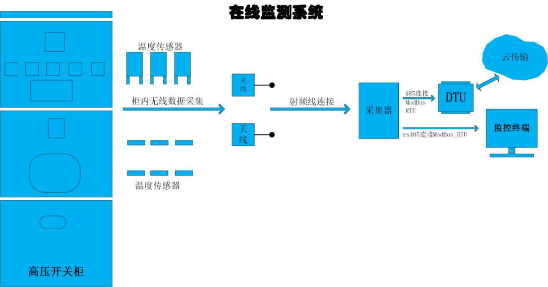 电力设备状态在线监测系统可应用于变电站和配电房,实时监测开关柜、变压器、环网柜等电力设备关键接触点的温度,系统由温度传感器、射频增益天线及温度采集器组成,温度传感器直接接触并测量一次设备的温度,并通过射频增益天线将数据传输至温度采集器,采集器通过有线或者无线的方式将数据传输至服务器进行数据分析及展示。